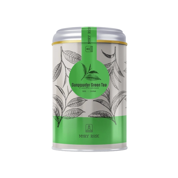 Ceaiul verde Gunpowder Green Tea de Mary Rose provine din partea de est a Chinei. Numele său se datorează asemănării sale cu praful de pușcă real. Acest lucru se datorează faptului că, în urma prelucrării tradiționale, frunzele de ceai sunt rulate în muguri asemănători unor bile. Infuzia are o culoare chihlimbarină distinctivă și un gust intens, cu o notă acrișoară. Este o sursă excelentă de teină, care se traduce printr-un efect stimulant natural.